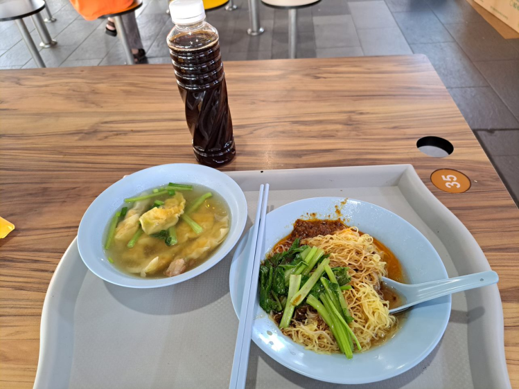 踏入美食中心里面,食物种类多不胜数,有西餐,华人餐- 云吞面、鸡饭、煮炒、粥、酿豆腐等,印度餐,超多样的! 干净。最后我叫了水饺面-SGD3.50。 桌上的食物饮料才SGD5.00 。这时我感概手里的5块钱颠覆了以前的用钱习惯。