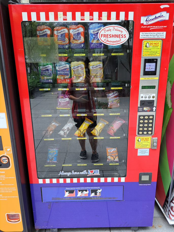 这贩卖机是我偶然发现的。来时路我换了条,因为不时有人玩🛼滑轮鞋,小孩学走路与父母,大婶aunty 打太极耍扇子。转换道路迎惊喜。 在此我也见证到方便的等级。随手可买到面包和三文鱼,还有鲜榨的橙汁。当然也有受欢迎的ice-cream, 饮料和零食。