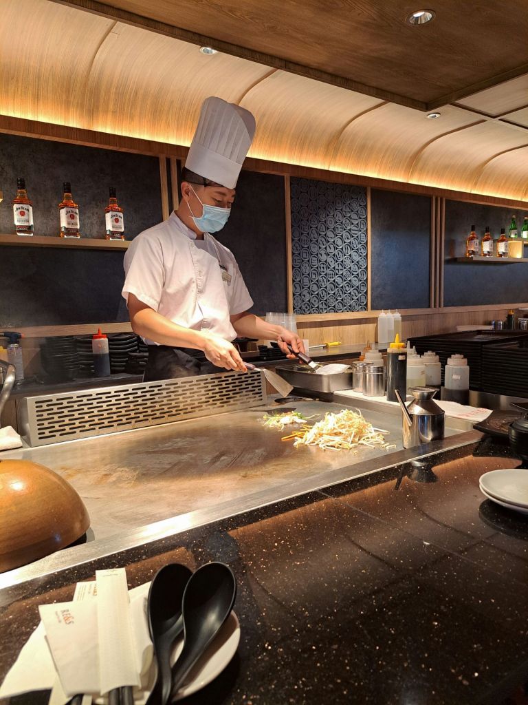 吴老师想喝杯咖啡, 走入日本街, 走到日本料理店, 我初尝了现场煮的日本料理。米、牛肉、豆芽、salad和甜品。吴老师就是我的新加坡妈妈, 特别照顾我。 祝她一切平安和顺利。
