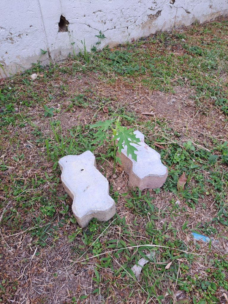 一早路过他人家后巷, 我不知道家地址、不认识屋主,不懂这木瓜是有心插柳还是无心。 看来现在长苗了,2个砖块维护它。我想到自己BearHill的木瓜,多产和常被人垂馋,