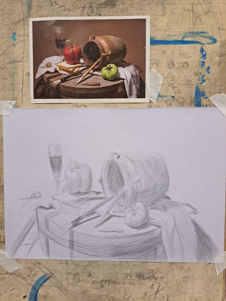 挑战自己用钢笔描线, 再用铅笔排线。 错, 知道错, 不可以一再错。 对, 需要再接再厉, 建立更多的基础。 最后的过程是, 当局者迷。 最后的结局是,距离作品太近, 看不到整个的完整度。 大观 赏画 审美。
