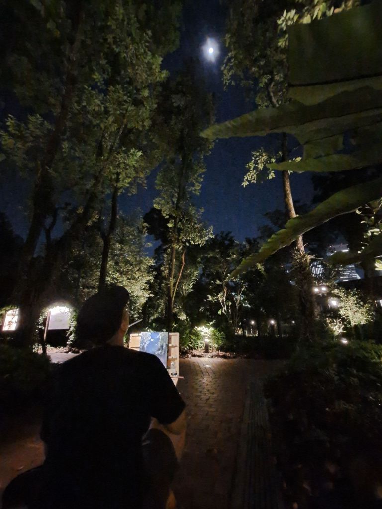 和俩位艺术家在Fort Canning Park 出外写生。 一位看到空间隧道穿梭的壮伟, 一位仰望遥远明月千里的淡雅。