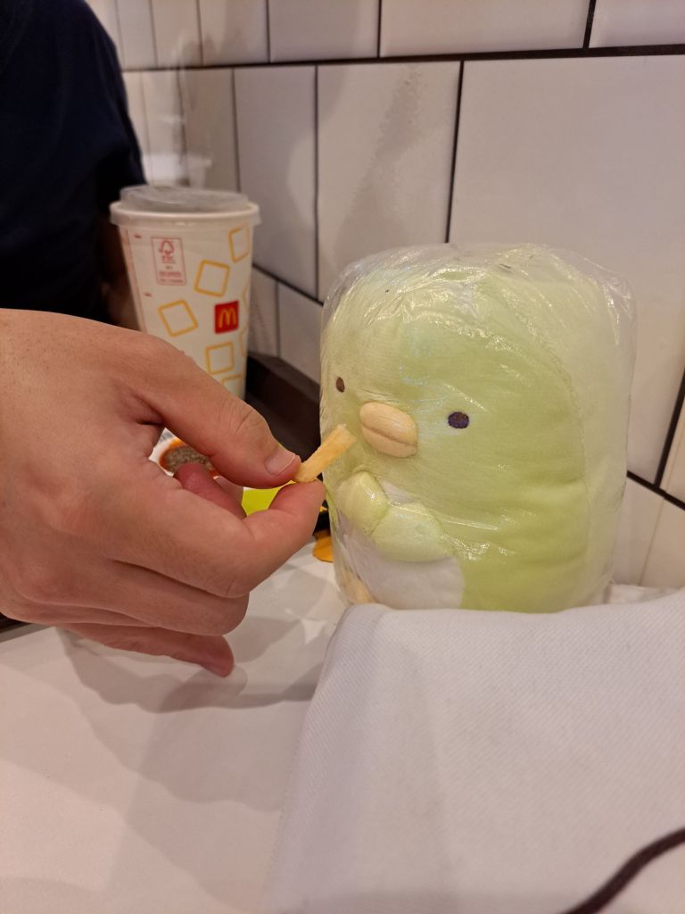 从这个角度, pen² 呆呆眼里望着薯条, 嘴巴流露对它的欲望好真实, 手短脚短。 Mehmuel ‘’听到‘’ pen² 的诉求,投喂过去。