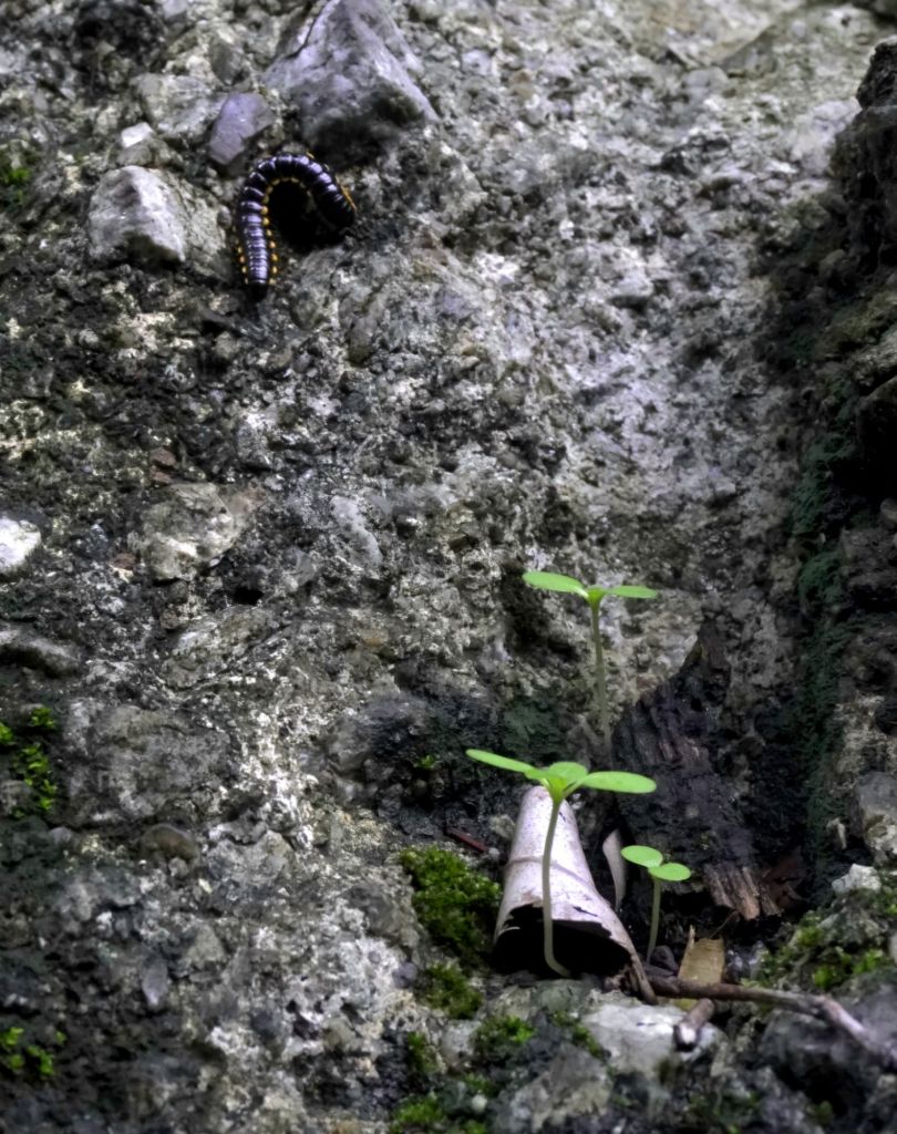 马陆的家在斜坡空间里, 转角踏出家门它走着走着, 噢走着走着几多步呢?(那么多只脚), 算不完呢。