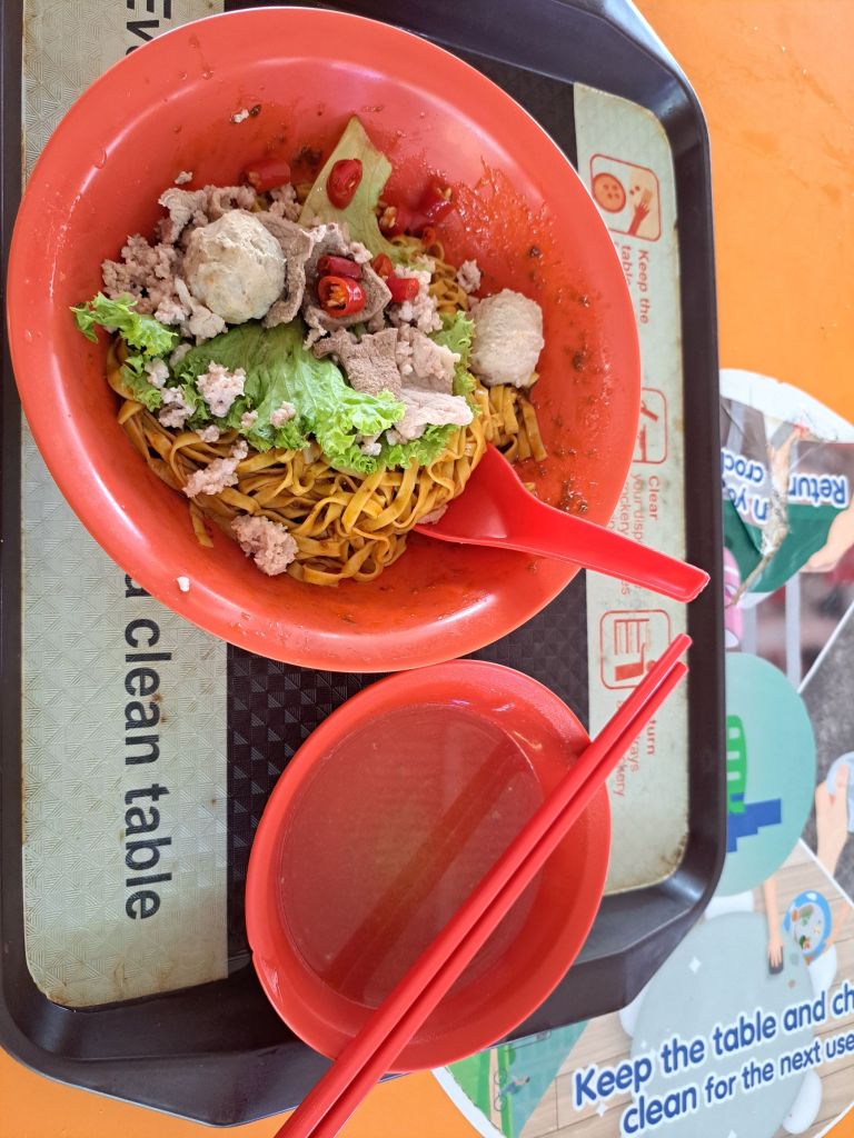 指了地图, 指到AMK 地区的foodcourt. 去吧去吧!热闹的早晨, 我一排一排看, 选择要吃的。 最后落户干捞面🍜。 照片诱人, 价钱$4.20 也合理。