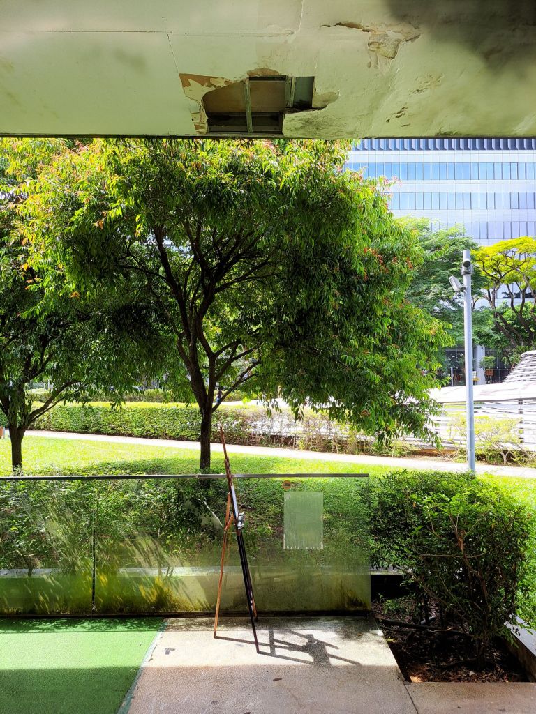 放眼遥望, 草绿有不同色调。 树🌳影子的色调渐变。画架的影子明显, 地砖的透视。