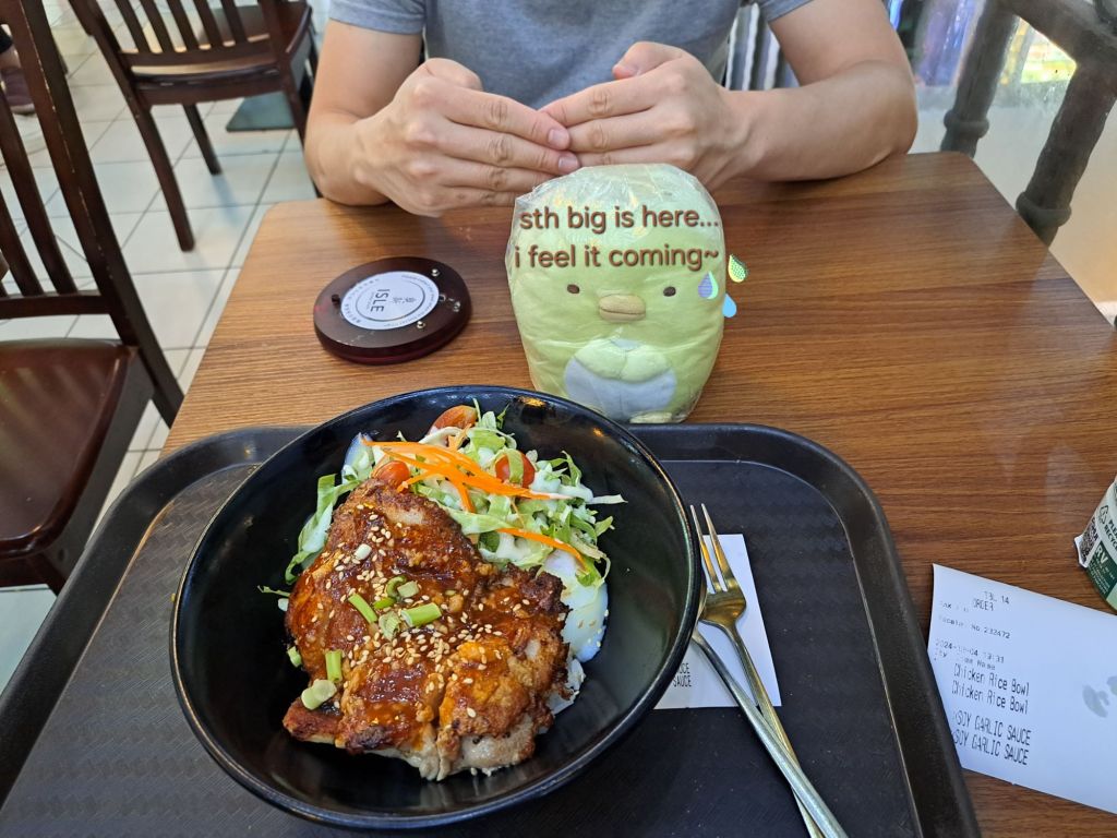 新尝试chicken rice bowl with soy garlic sauce, pen² 发现egg gor 其实在里面。 它想打救egg gor 但是来不及了。 生蛋煮成熟蛋了🍳 mehh~