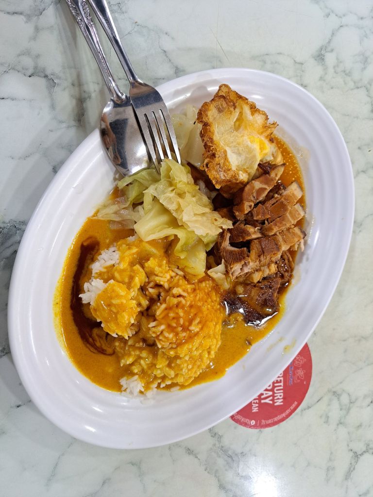 接着我还钱后, 看着年轻的她, 勺了饭, 拿包菜,鸡蛋, 剪卤肉‘不要这样肥’’-我说。淋上咖喱汁, 卤肉汁,一点甜酱。 ‘谢谢!’