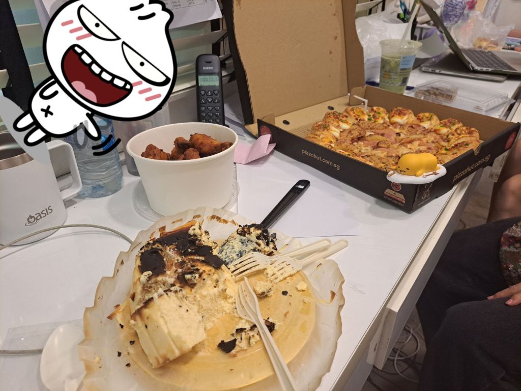 啊! 幸福的一天!终于等到周老师的 basque burnt cheesecake-烘培技术. 和惊喜吴老师请pizza 和chicken wings 🎂🍕🍗. – 慰劳大家忙蜡染工作坊。