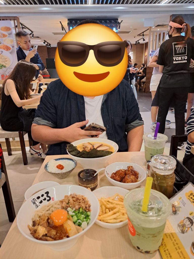 和老哥晚餐, 第一次这里吃日本拉面。 慰劳自己,喝点很久没喝的冰-抹茶黑糖珍珠奶茶, 甜和冰 啊‘’双重奖励‘’。 选择辣的竹笋鸡肉面。🍜🍟🍗🧋, 放弃了我比较喜欢的不辣面。