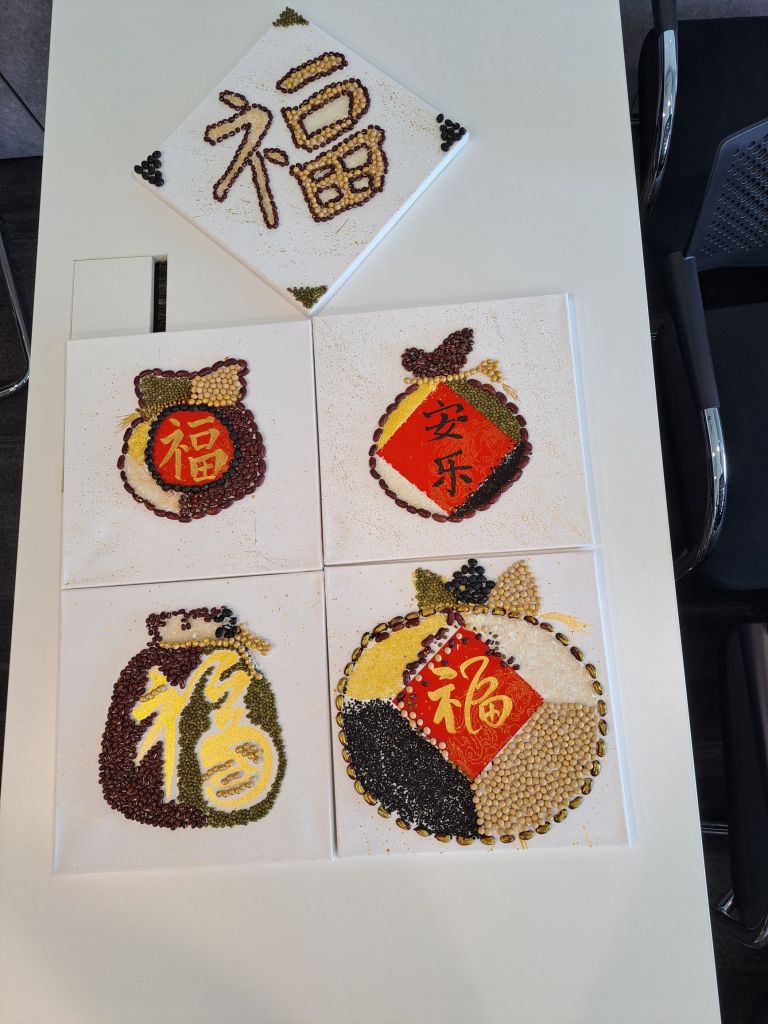 大米, 黑豆,红豆, 黄豆,绿豆-五谷。我写的‘’福‘’点缀了他们的canvas, 围绕着福的创意设计, 看出不同人的想法。我也尝试了一番被别人围绕好似明星签名的感觉, 要我帮忙写书法‘福’,‘顺’的字。有定制的感觉, 大小, 黑墨金墨,直接在画布或在红纸, 字型, 哈哈哈!