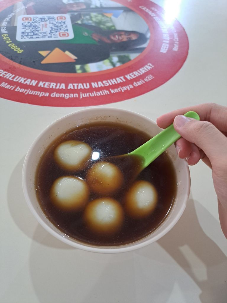 想放下了饭, 去叫糖水。 左看右看, 鸽子在左右。 哈哈, 算了吧, 吃先, 等下才叫。 我的饭我还想吃的。 姜汤汤圆,每粒花生或黑芝麻的都是$.40。不甜,后来后知后觉, 初十四, $2.40 噢不错!