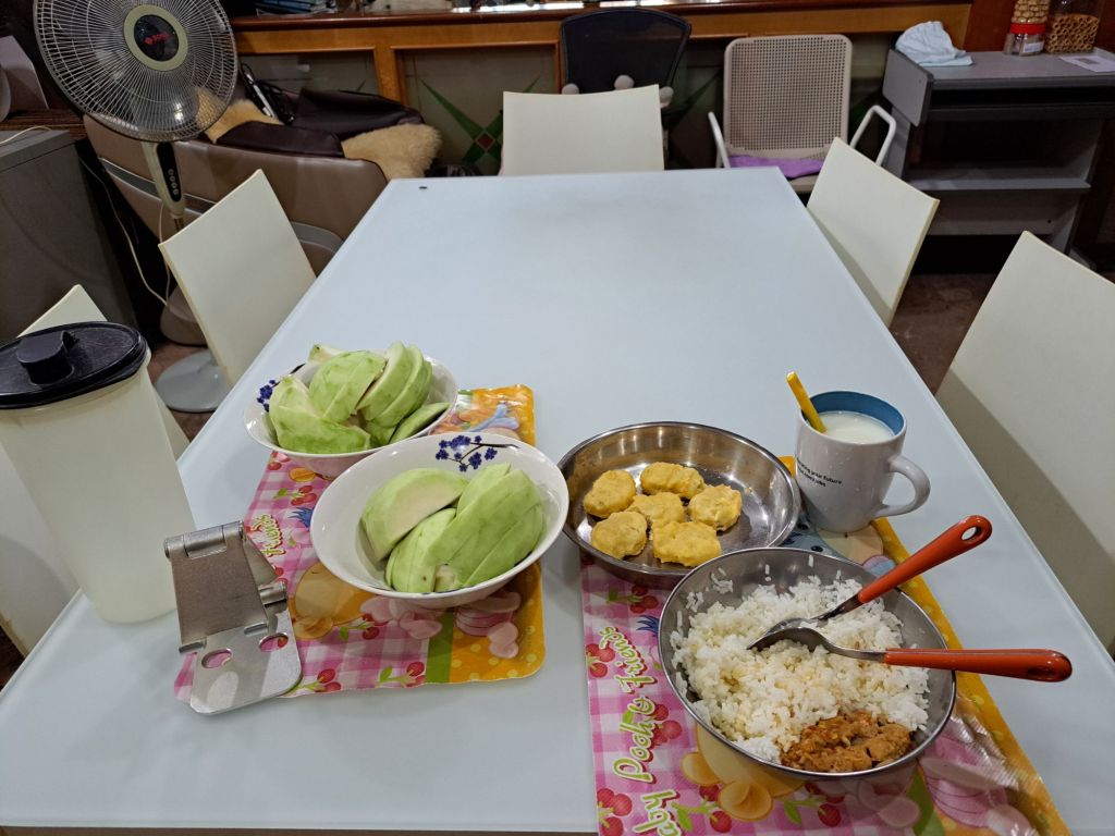准备了guava x3, nuggets, thai basil rice, 一杯牛奶。
