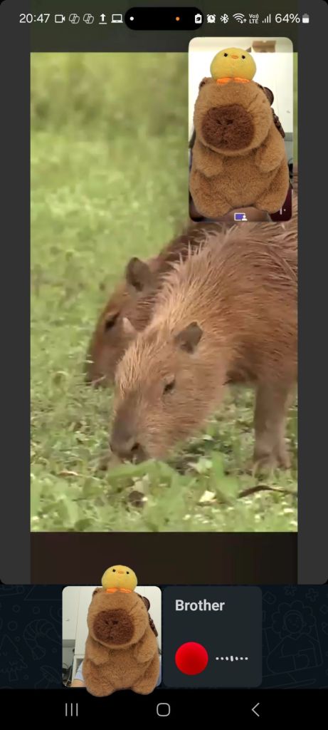 无聊的老哥, 哈哈, 在我把Barbara和egg gor 和Mr. Bean banana chocolate pancake合照后, 他video call 来,share screen 开了 capybara 的video。