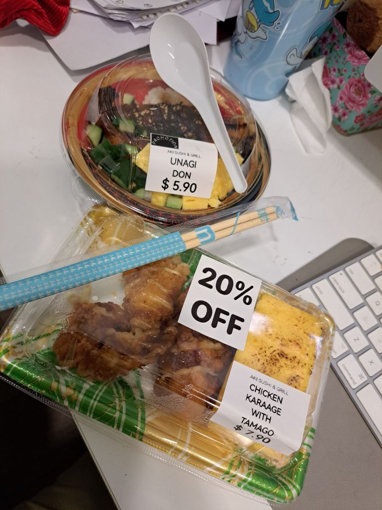 先前我想着aiya 忘了拿现金, 想转头, 但快关门的时间段, 9pm, 我不能往后去。如果不允许我用Paywave , 那就算了吧。 不过一切船到桥头自然直。 顺利的可以刷卡和问到了buy one free one deal, 虽然不是再加$5.90 *20%off, 这俩个选择是我的选择, 自己赚来的钱, 自己开心花。 当然我的贪是有度的, 不要拿salmon的, 而选择了chicken karaage & tamago。
