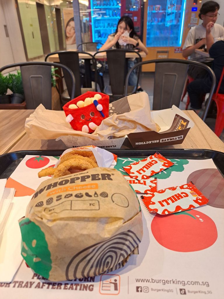 在Nando’s 的方向, 看到了长龙。 在Mala的纠结, 想到价钱的对比。 我看着手上的fry fry, 就这样吧, BurgerKing’s 吧。 Google 看 有什么coupon。放着fry fry 在我对面坐着陪我吃。 也蛮可爱的。 🍟