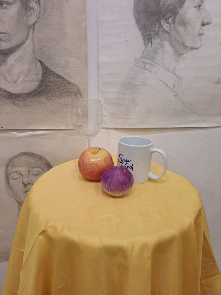 终于把Mehmuel 的想法慢慢实践了, 打印他建议的reference 图。 是教案的一份子。和多一组静物组合。 和买个耳朵石膏和人体肖像的灯。