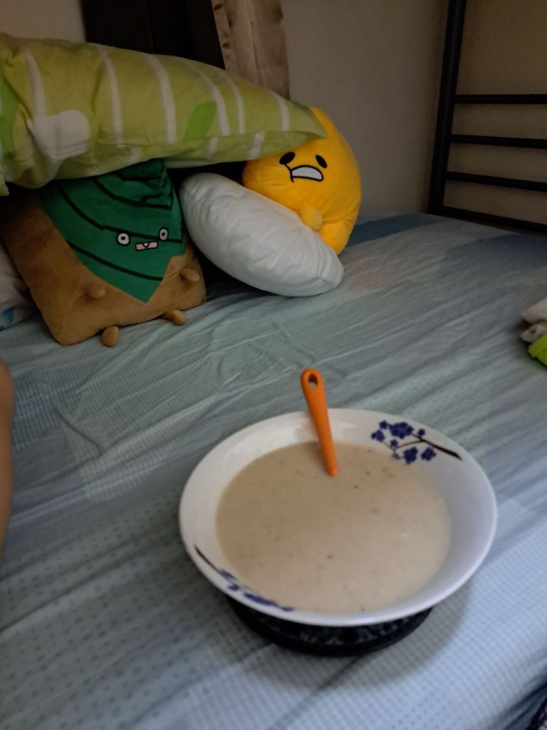 冲凉, 刷了个牙, 用了May 的电子煲, 之前请教过她如何用。 免了使用gas cooker 和锅的麻烦。 煮了碗蘑菇汤, 我的晚餐和一包Meow meow chicken flavour 零食。