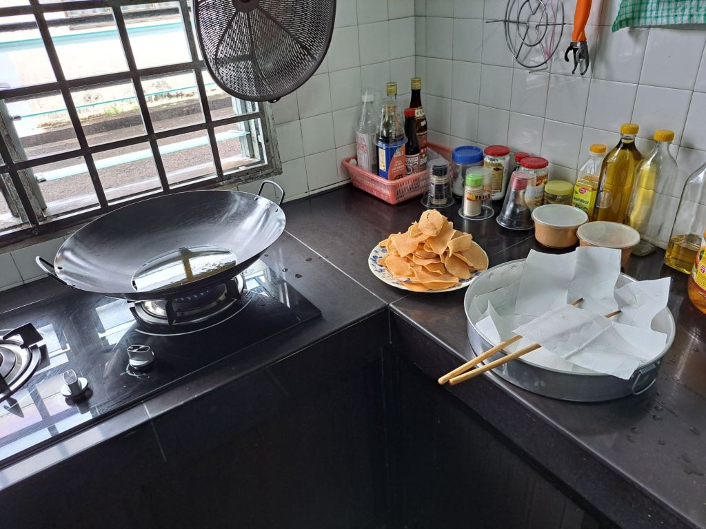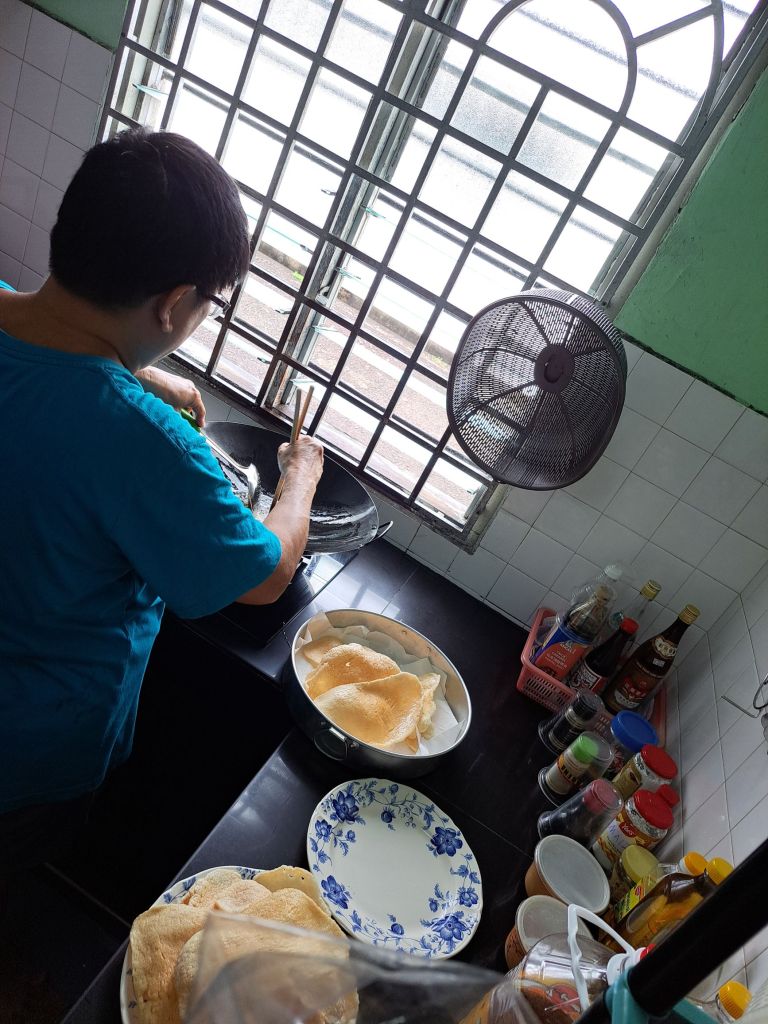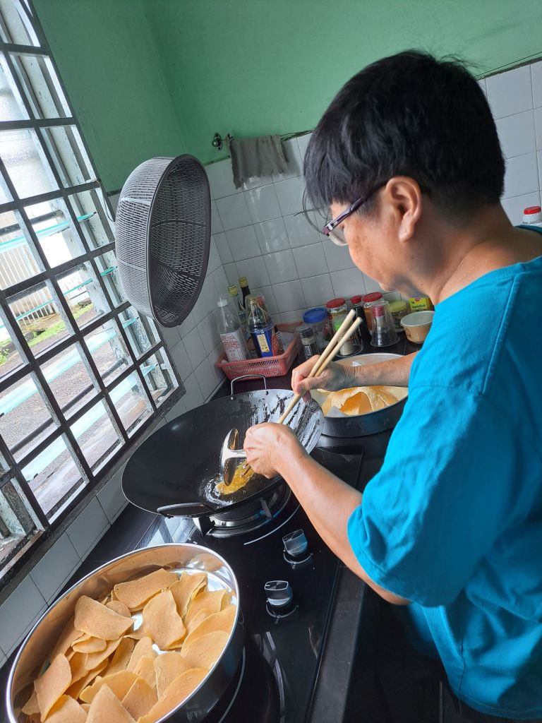 没想到和Mehmuel 不久前说到的虾饼, 老爸老妈突然和小舅订了2包虾饼。 帮老妈炸完了。 老妈说, “虾饼那么少的?” , 我说, “当然啦, 你一边炸一边吃嘛”。 老妈一边咬一边笑。 哈哈!