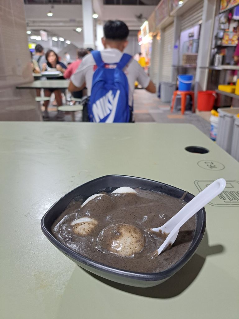 走到Albert Food Centre 去 找我念念不忘的糖水 -黑芝麻糊😋, 另外加了4粒黑芝麻汤圆, 不要花生, (肥肥的我, aiya)。 $2.50 +$2。 找了个座位, 思考下今天的晚餐消费 $8.30+ $4.50, 哇哈哈 花了$12.80, 哈哈okay 啦 就当俩餐的一起吃了, 今天的budget 还好。