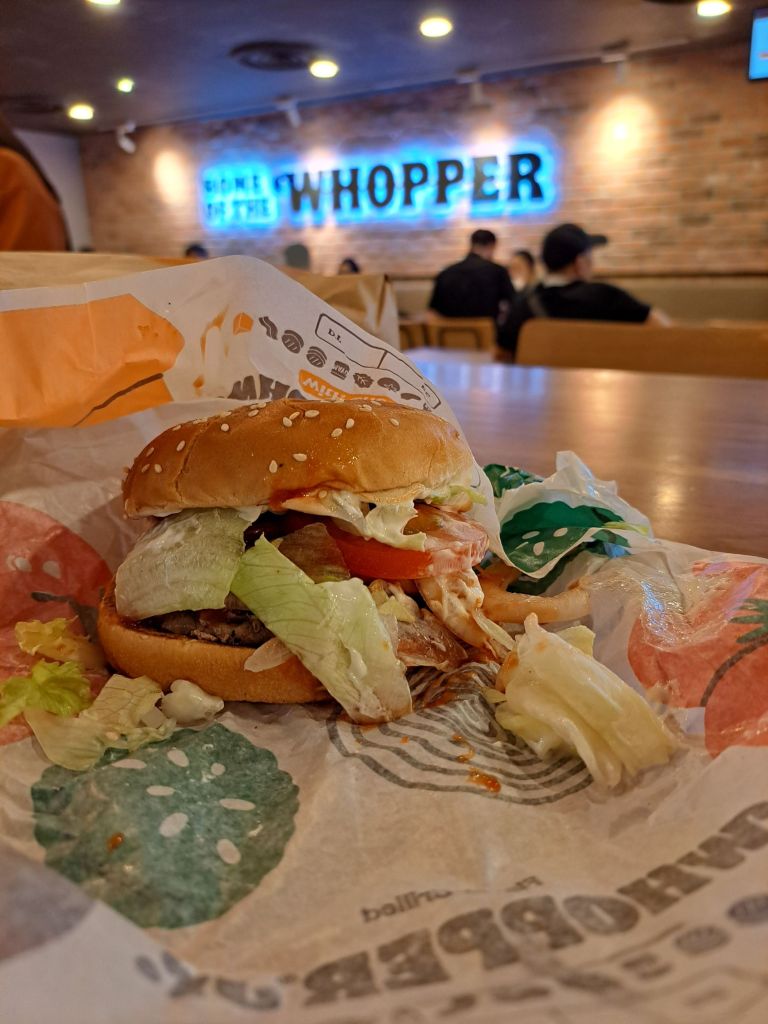 我一看,噢, 是QR Code。 好吧, 我scan 吧。 后来知道是Google Review, 心想okay 反正其实我也认定Burger King的 burger 可以吃到真材实料, 番茄🍅 pickle, onion, cabbage , cheese, fish 等, 比起McDonald’s 好很多。 而且$6 – Fish burger, Whopper Jr : Burger King coupon, 觉得蛮划算的。