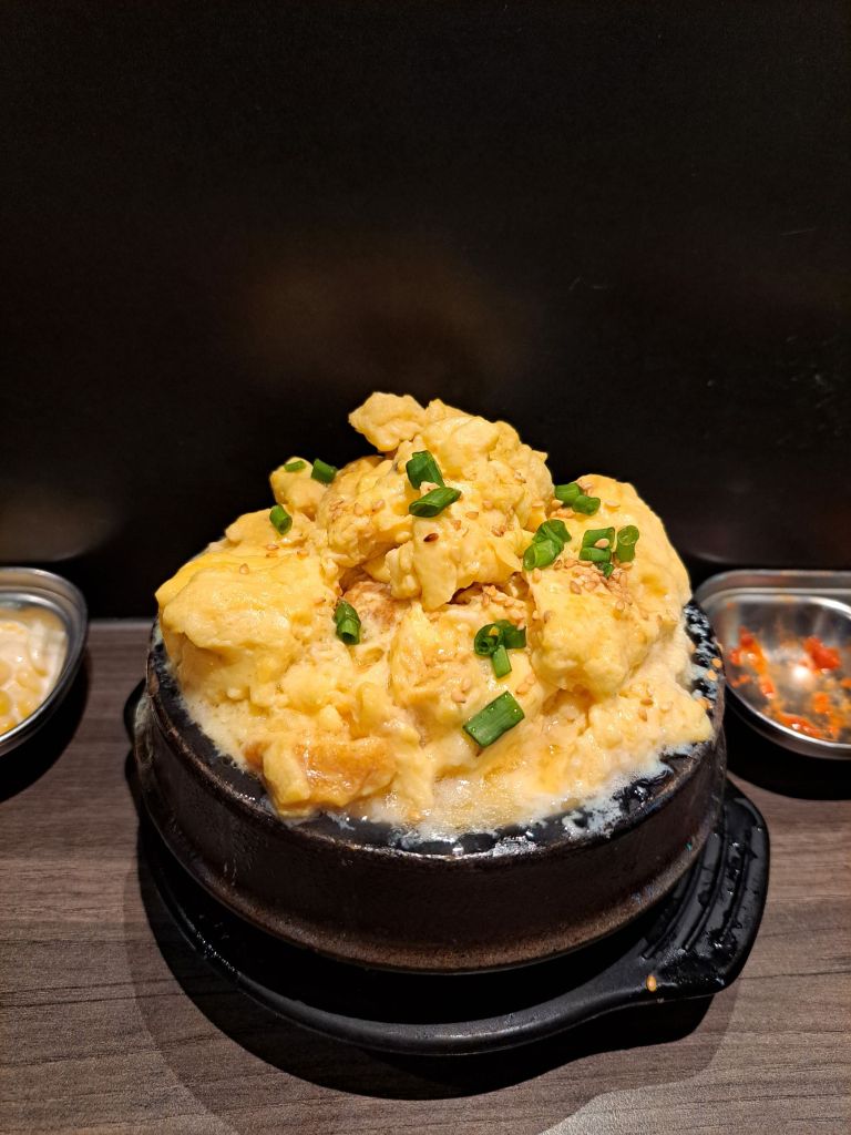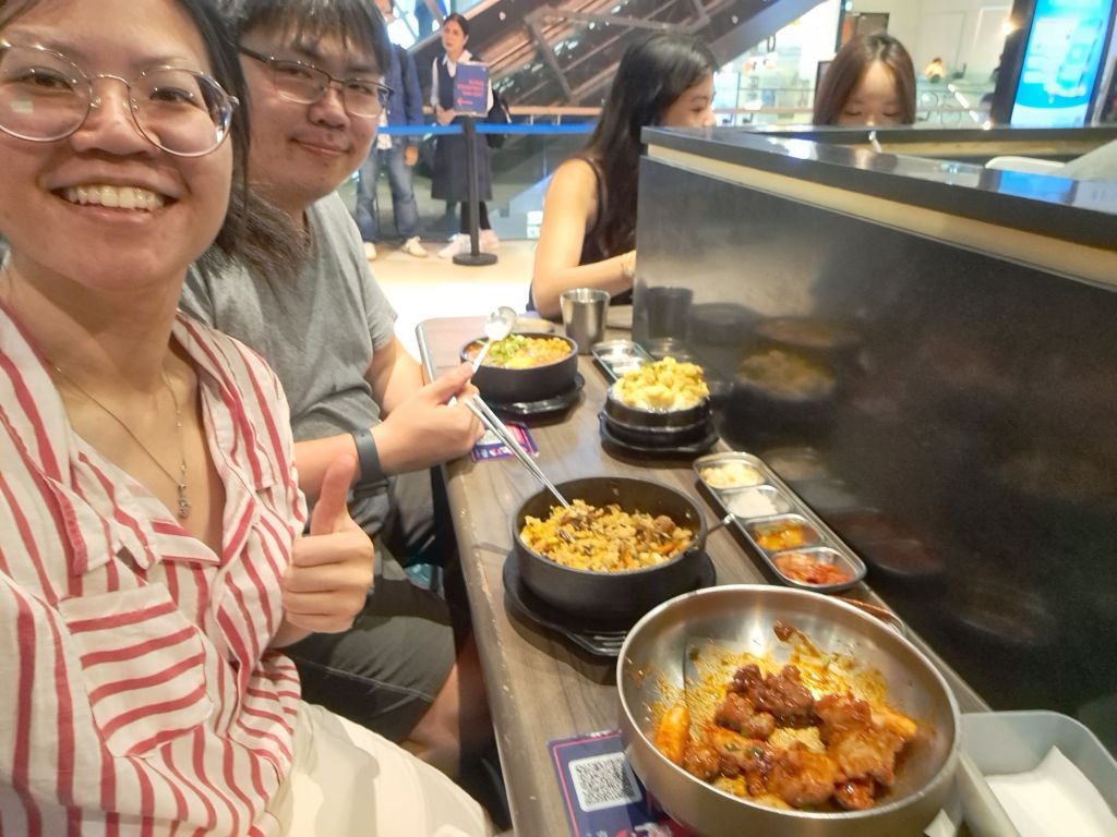 叫了Bibimbap with pork, chicken bulgogi, 他另外叫了 steamed egg, 还说上层好吃, 里面的不怎么。厉害吃, 哈哈哈!
