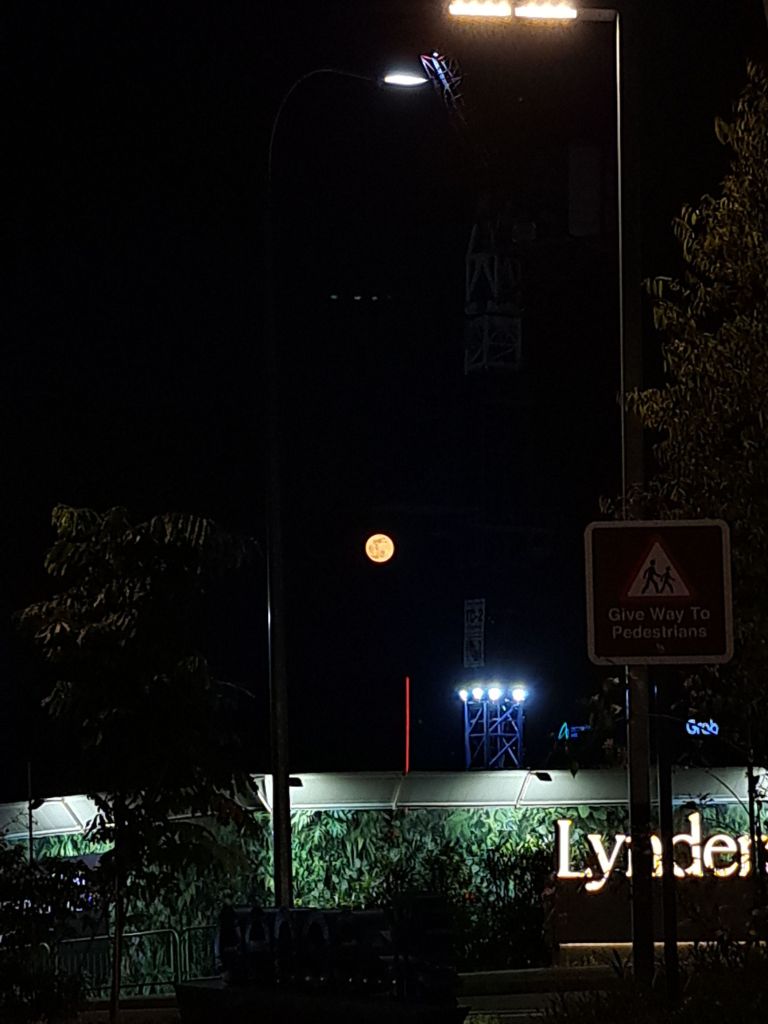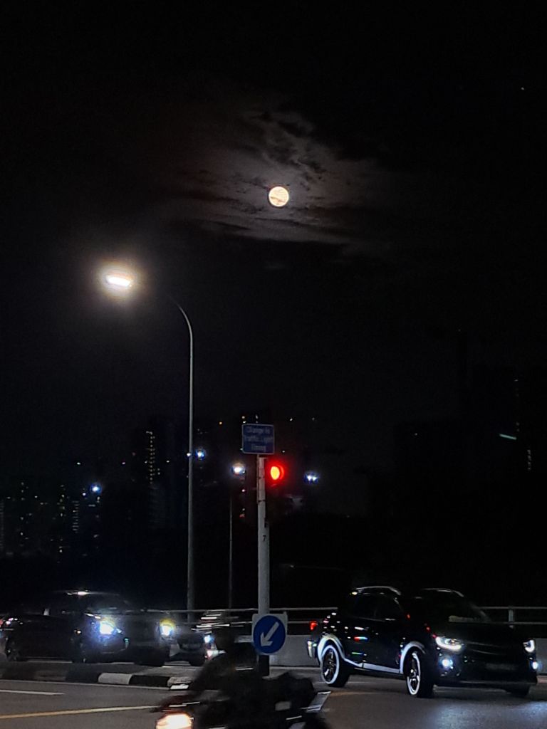 今天有缘在Science Park区, Kent Ridge, 新加坡西部,我欣赏着月亮, 感觉有莫明的快乐。 video call 老妈,邀她也去欣赏今晚的月亮。