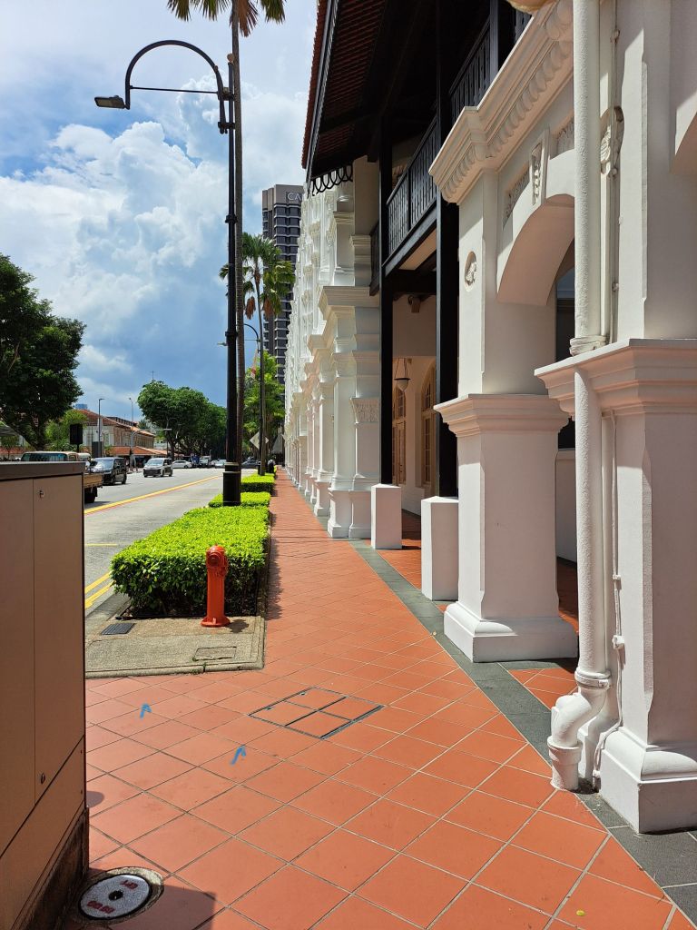 我没有三只手, 不能雨伞和相机并兼。 唯有看左看右, 哪里有景我可以拍的。这一路沿着 Raffles Hotel 的走廊和行人道, 太阳特别勤劳。