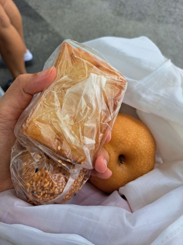 我在新加坡又多了个老妈, AMK妈妈, 一直给我食物。 今天我串时间做night shift迟出门的当儿她从巴刹回来。 带着新鲜热的萝卜糕和煎堆绿豆沙给我, 和大大粒的梨。