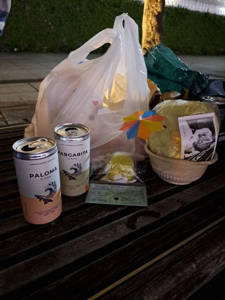 和Mehmuel 分享了我在Boutiques Fair 买的2 瓶 non-alcoholic beers, 和他买了些pizza, 我们一起吃/喝/看看月亮/聊天。