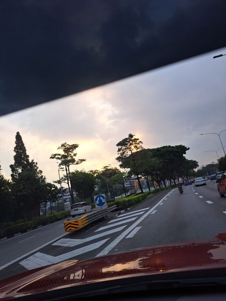 精彩的, 在回去Dhoby Ghaut 的时候, 我看着奇妙的一刻。 一整粒的太阳🌞照耀, 难得可见的。 慢慢云朵遮挡。 那曙光很特别。
