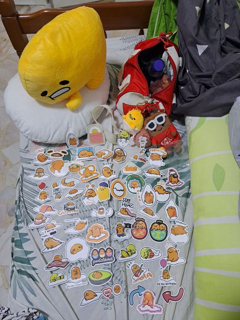 在Dhoby Xchange, this is for you, 他转身拿出parcel, 哇我没想到ahhh! is egg gor! 很有我的心, 买了egg gor 锁匙圈给我。💛💛💛! 还有sticker。可爱的egg gor 有着小小的手我拿起来玩, 然后放下, 放在Mehmuel 的座位旁。 我们之间。