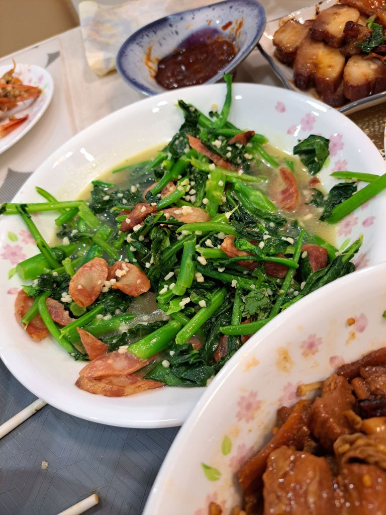 “不然这菜我来炒。”,’可以啊’。和吴老师毛遂自荐要炒一道菜 – 芥兰。 “你有腊肠吗?”, ‘有啊’。“啊, 正好!”。我就这样找到了我下厨的机会。哈哈!给吴老师和大家试试看我的厨艺。