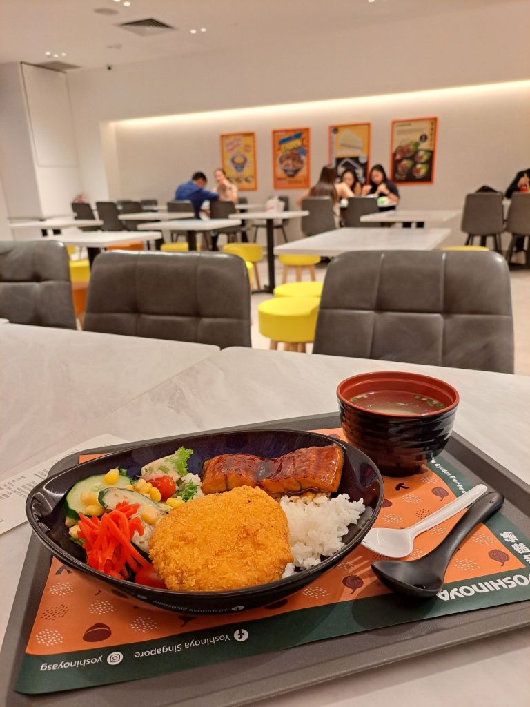 下着Cathay atrium的楼梯, 左看右看, 哎哟不错嘛 蛮多学生一起聚会玩玩卡聊天的。 我也顺便回顾下自己, 是否有过如此的经历呢? 走着, 路过YOSHINOYA, 听说这里的beef rice gyudon 便宜值得吃。 看着menu但我比较喜欢salmon & unagi, 看看下噢 有也! 我就当机立断要吃这里的unagi salmon don。