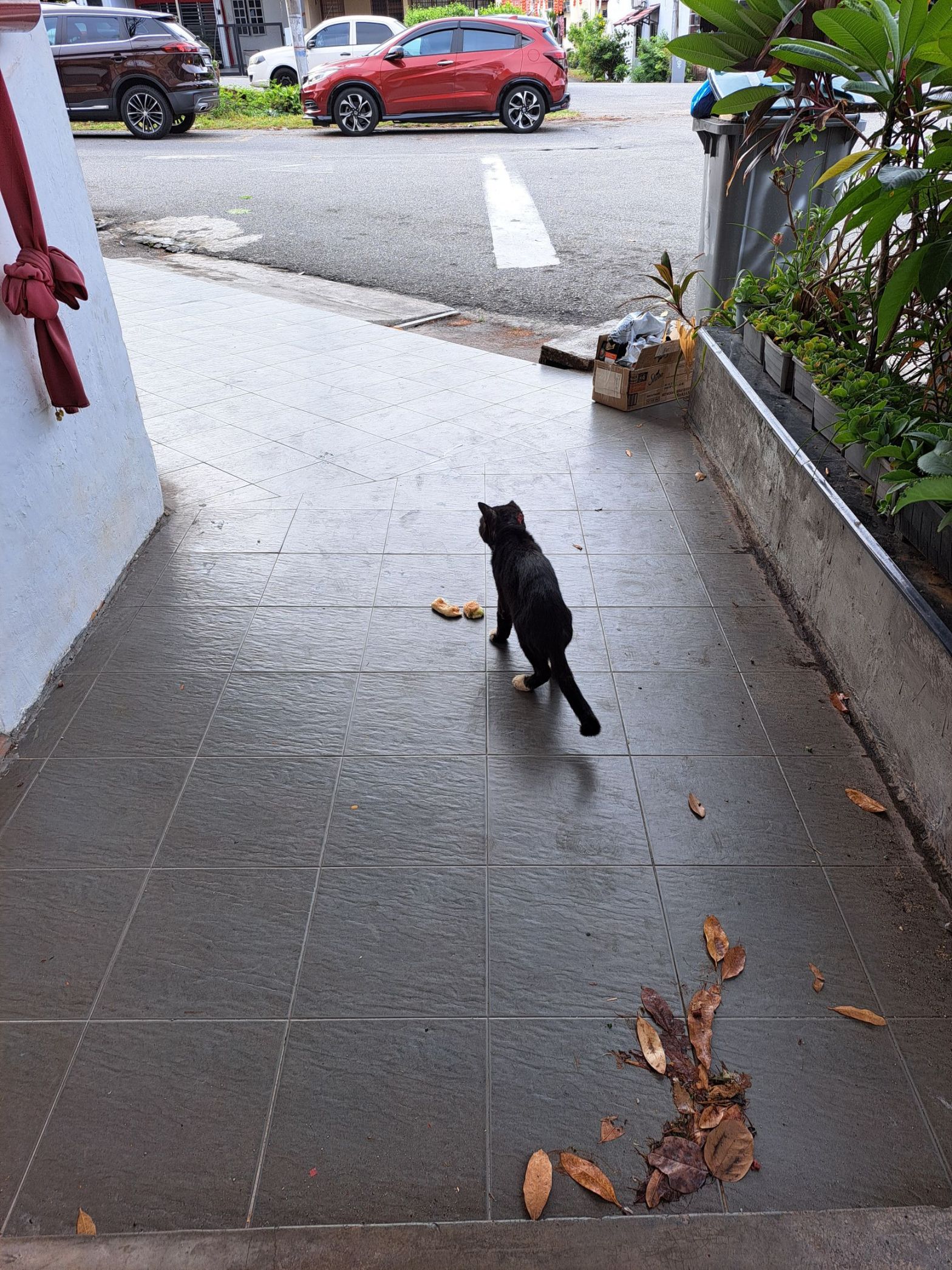 16 Feb’26 0930 不知是谁家的猫, 还是它是到处流浪着。 ‘’可怜耳朵受伤了, 脱皮了‘’-老妈说。 我知道我(们) 做不到带它回家, 或看兽医医治。它的确没有ahkaw 那么幸运,找到主人, 有吃喝有医治机会。 ‘要不要给它点面包?’, 我问老妈。 以为老妈会骂我。 给它点。 老妈帮我拔了点kaya面包给它。‘如果它okay吃, 我们给它整个。 ’-我说。 它嗅嗅下, 我和老妈看着它到底吃不吃呢?很难可以吃, 不像我们有手, 看着它快要30+秒, 但它没吃, 走来我的脚下, 我走过去面包那里。 企图引它过去吃。 给它整个吧, 到最后我不知道, 它吃不吃。 我尽力了。
