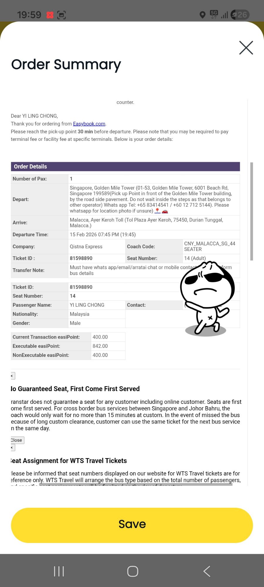 11 Feb’26 1959 最后确认了, 我还是坐巴士回家吧。 不是担心TB, 而是想想下吴老师和老哥说得对, 坐巴士不需要老爸老妈那么累来接我, 他们也可以准备买菜收拾家, 我也可以在巴士上躺着休息下(或可以写日记)。 贵是贵点 $40, 但是直通Melaka, 我觉得可以可行。 老哥先到家, 我才在周日15 Feb 或周一凌晨 (除夕)到达。 开启着我躺平的多日, 哈哈! Menteri BearHill is coming home! 🧳🚍😏