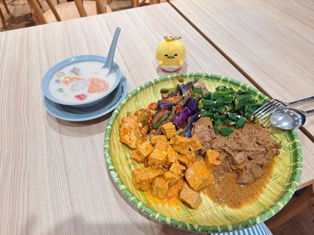 选了North South Line 一路在City Hall 时 我没有冲入往Pasir Ris 的方向走去。 等不及到Pasir Ris 才吃了, 饿。 俩粒egggor 耐饱到现在。 回到 The Food Place foodcourt 逛了一圈又一圈, 我还是回到 nasi padang 去。 嘴馋的我, 额外叫了碗 bobo char cha, 哈哈😋