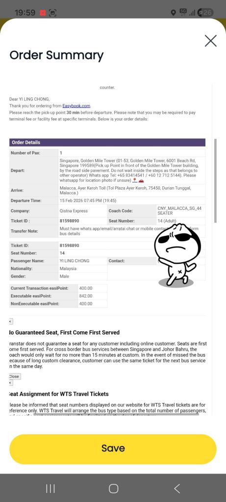 不是担心TB, 而是想想下吴老师和老哥说得对, 坐巴士不需要老爸老妈那么累来接我, 他们也可以准备买菜收拾家, 我也可以在巴士上躺着休息下(或可以写日记)。 贵是贵点 $40, 但是直通Melaka, 我觉得可以可行。