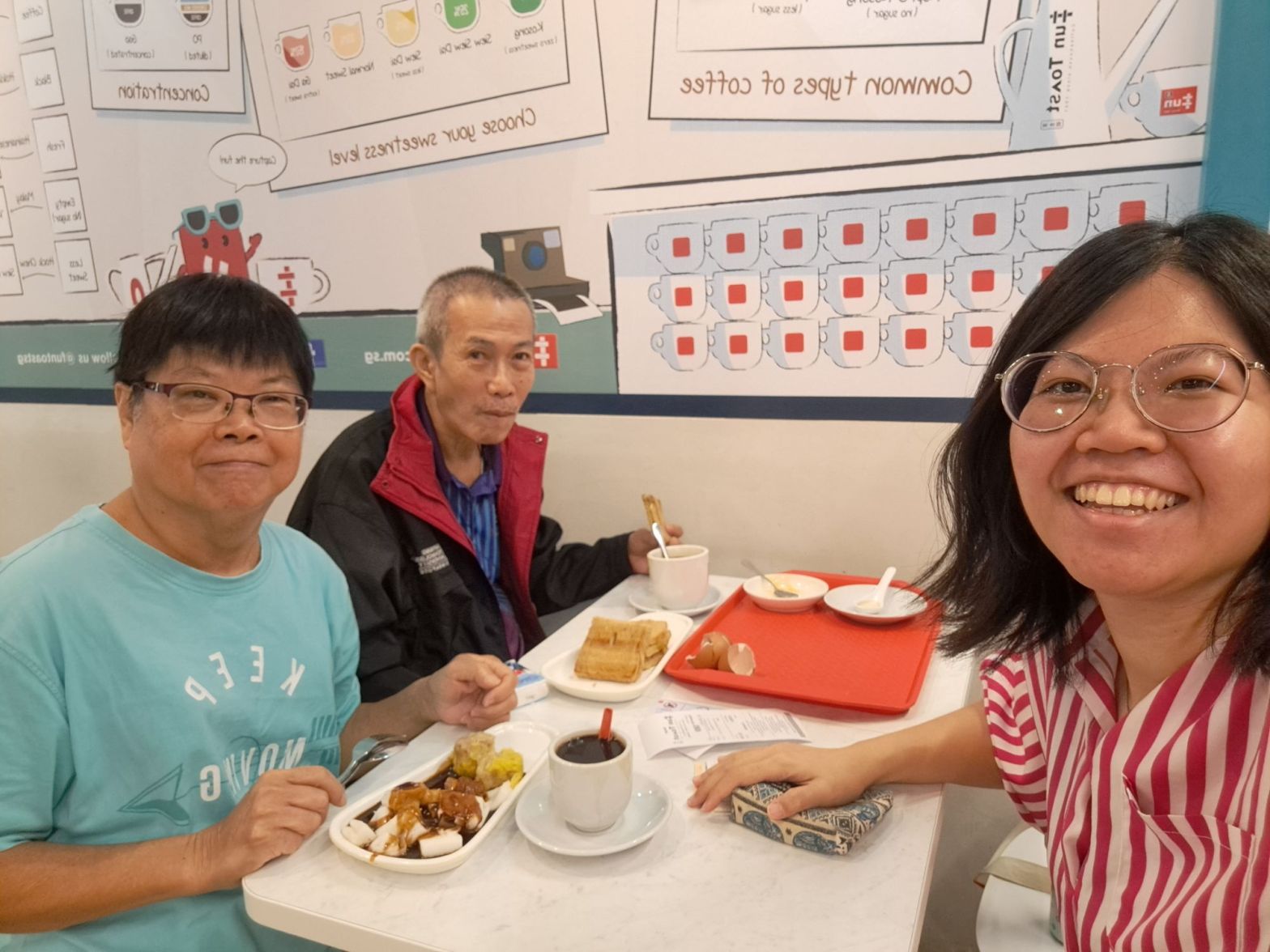 有大概个25分钟我才上班, 点了鸡蛋面包咖啡给老爸, 老妈要了猪肠粉加烧卖& kopi。 悠哉的等老哥来。