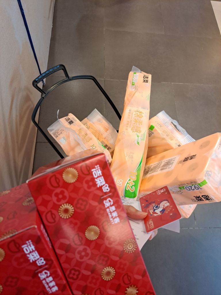 ”看你买那么多纸巾,这里送你俩包纸巾“,’哈哈, 那么好,谢谢谢谢!‘