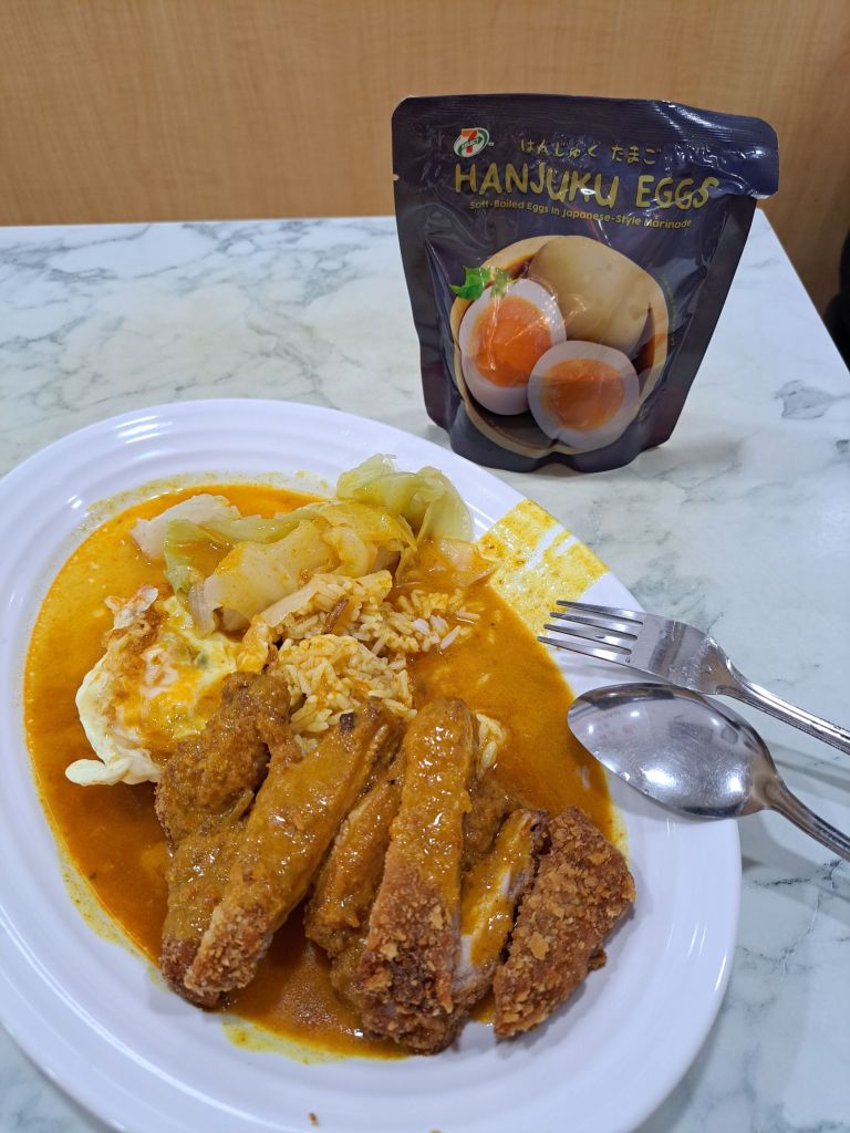 还是最后选择了在非上班时段去找, 终于买到了! 带着egggor 左窜右窜Plaza Singapura, 路过南记包, 一别常吃的杂饭,来盘咖喱鸡排饭, 不要卤肉, 可以省点钱和卤肉太肥了哈哈!“我要这里吃, 咖喱鸡排饭, 6号少饭 Paywave”-我点。看着盘中饭, 我说 “饭再少一点。 ”, ’再少一点就剩俩口而已。‘ ,“俩口而已也没事没问题”。