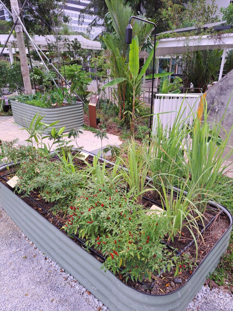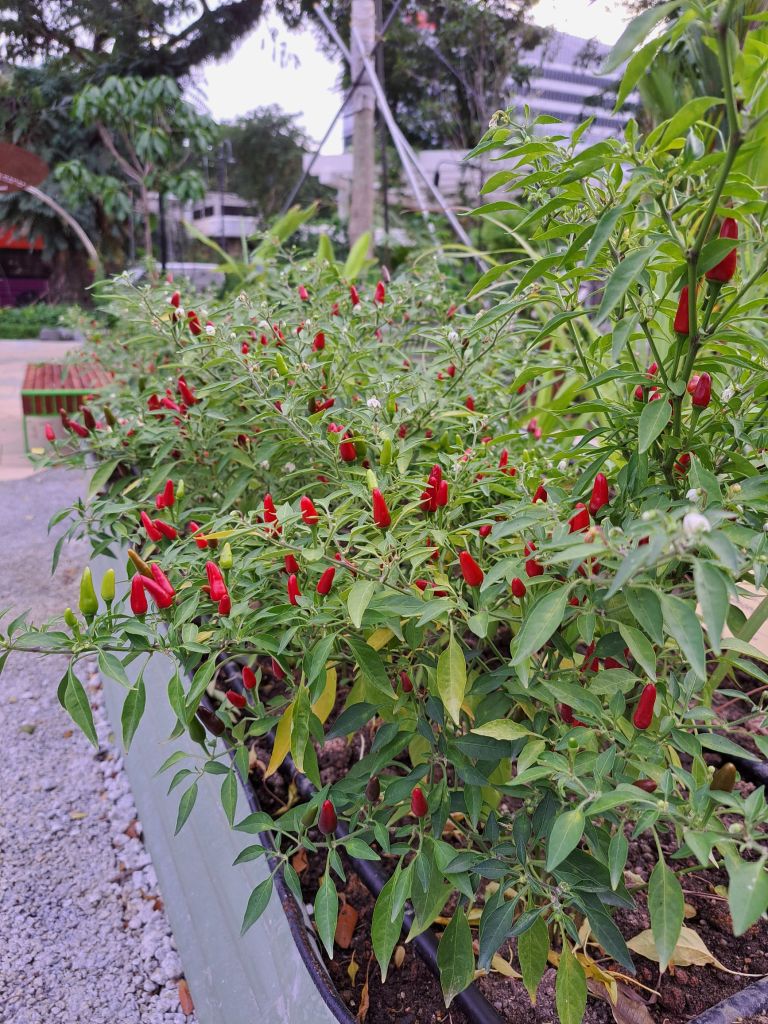 走着走着看着一旁的空地有着休息空间、谁家园丁那么厉害, 小小cili padi bird eye chili 🌶树居然可以生那么多,也还有花草herbs、我对比着眼前的香茅、咖喱叶、姜、pandan叶,噢BearHill no.12 好像都有。 是谁偷偷观察了我种过什么了是吗,哈哈!