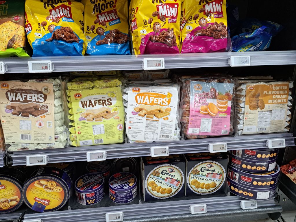 踏入ShengSiong看看, 外面摆了几盆仙人掌,🌵, 想到我以前的那些, 从Cameron Highlands 买回家的, 害死的几盆, 啊!现在是远距离的欣赏。人不出走不行,不会知道自己像只井底之蛙🐸, 原来我一贯买的wafer也有cheese& lemon 的口味。 不过那么巧, 我买给学生的chocolate wafer, 老爸也买给隔壁小孩当Raya零食。想着guava 难得买到了, 找个番茄🍅🍅去, 偶尔嘴馋上班时饿也好补补下眼睛。 你是最好的零食!这里什么都有, 但是我内心的战争遏制了我, hey 那些零食不健康、贵。