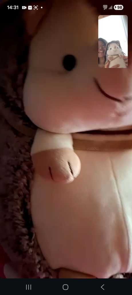永远就是一副看懂人生的样子, 却保持着天真的模样。 从它我看到我们一家的天真可爱, 让老妈捏捏它鼻子和摸摸它的金元宝, 再和我的pinepine隔空合照。好温馨!