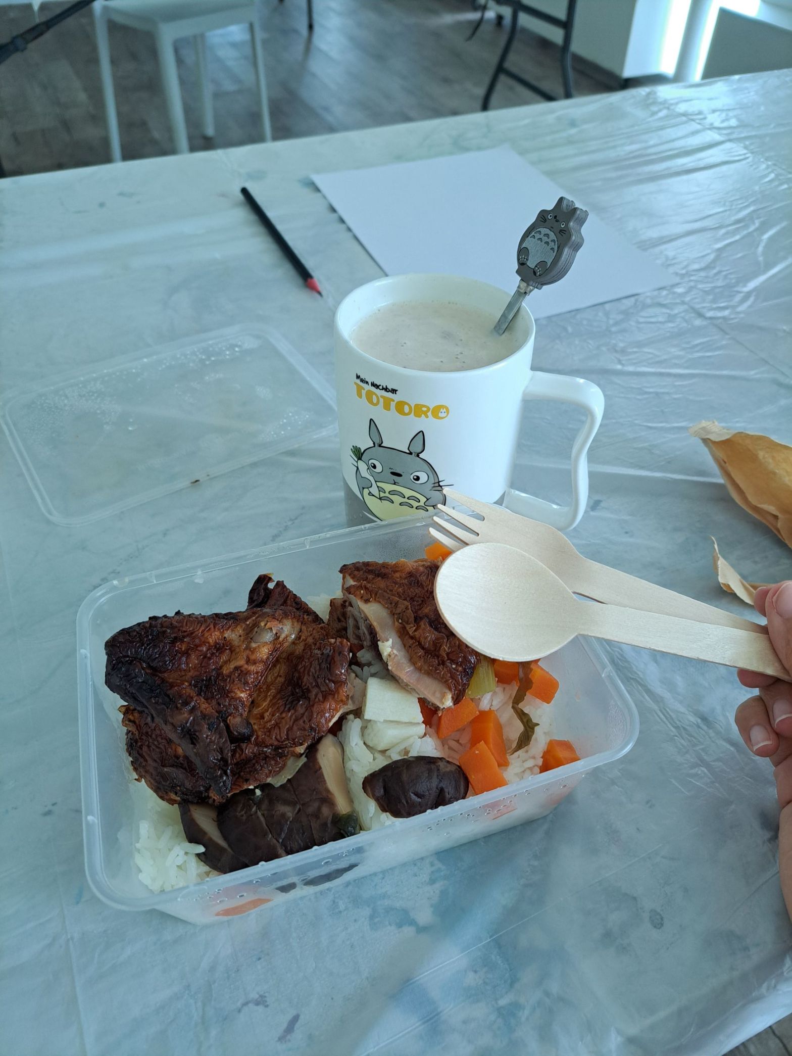 冲了杯牛奶麦片和弄烧了Christina 的住家鸡🐓饭, 我拿到展览厅吃, 一边看<CONAN>。这是个美丽的下午,温馨的午餐。😋