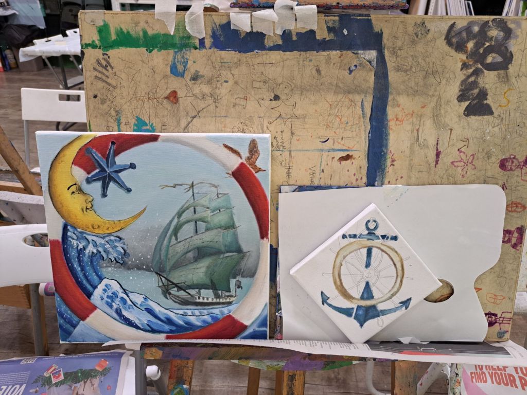 终于把船身看清楚, 补上海的颜色,加上蓝绿色加强了海和船的前景背景对比, 为老鹰?上色, 奸诈的月亮终于露出他猥琐的笑脸😏