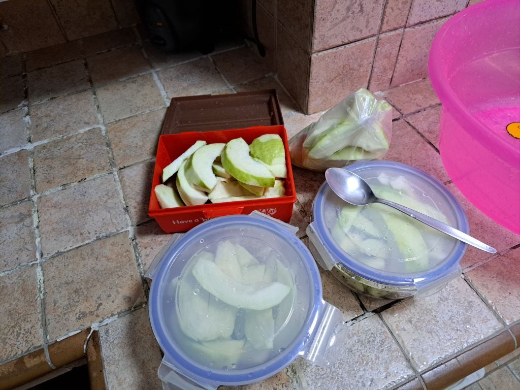 回到我的guava, 打算请uncle Beh 吃 他好奇’what is that so big?’ “Guava. You okay eat or not, tonight i cut, give you one haha!” 因为Christina 说过very hard 但看起来他想吃 那我就和大家分享分享。和想到Mehmuel 说orange 太贵, 他也没时间买和切guava, “i bought some guava, i cut and tomorrow i bring for you”。