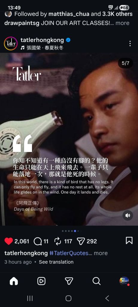 一只没脚的小鸟🐦, 根本不需要脚, 翅膀会带TA去想往哪里去的地方。