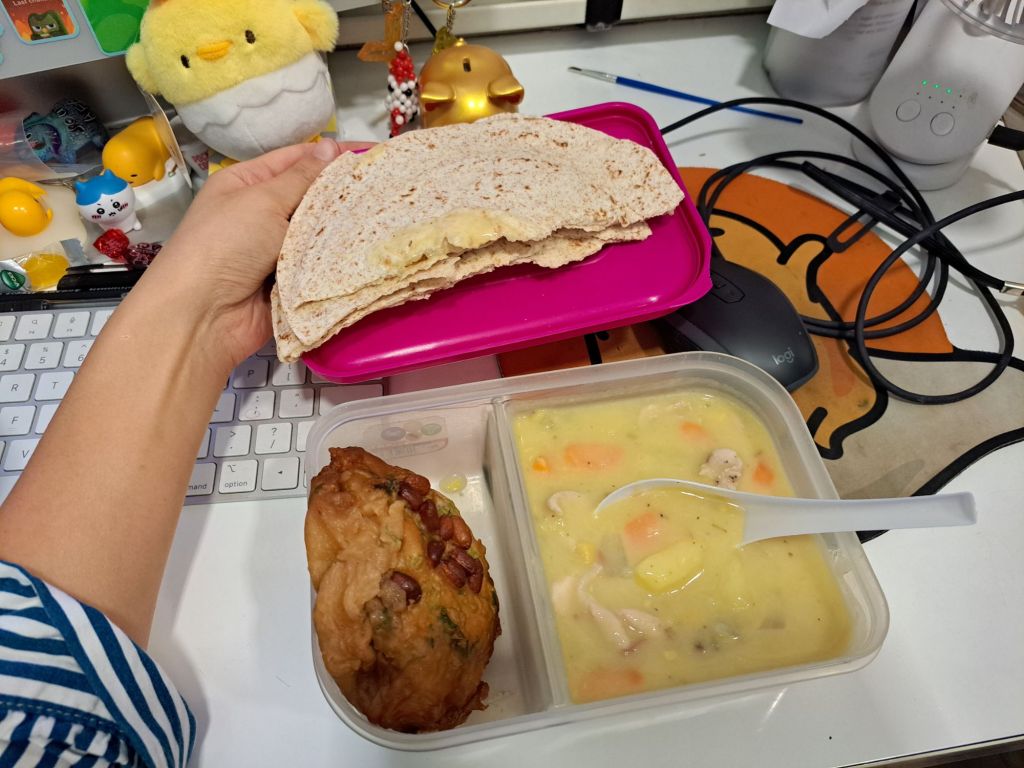 hoho! these are my lunch! 难得吃那么丰盛, 有着我买的蚝饼& wrap 2片,Christina 煮的改良版Campbell’s 鸡汤和吴老师买的BreadTalk 肉松面包。
