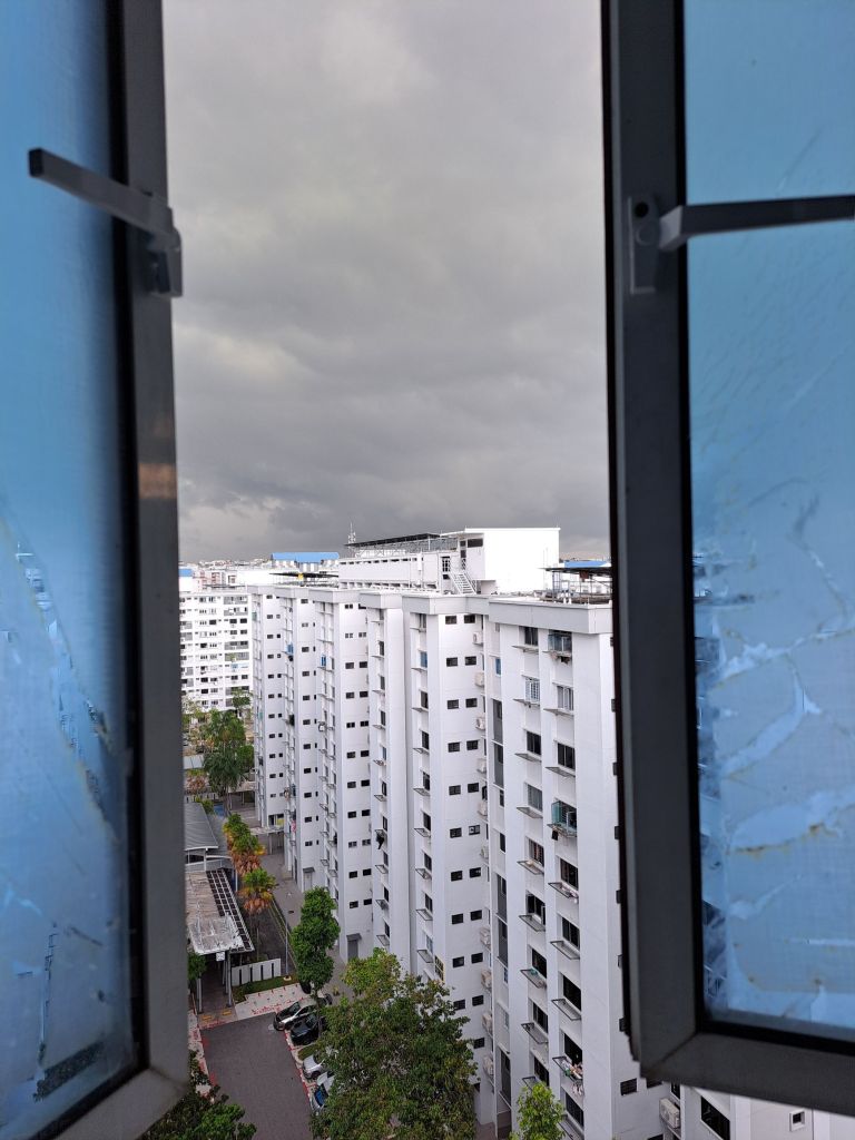 山雨欲来风满楼, 天暗暗以致整个房间灰暗被笼罩。后来的骤雨顺其而来,第一次看和在Pasir (Pensir) Ris感受到如此大雨,